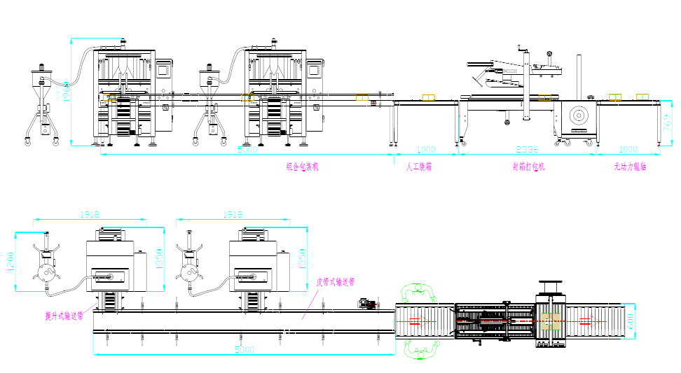 1.醬料、火鍋底料袋裝包裝生產線設計方案 主要設備:組合包裝機 → 人工裝箱 → 封箱打包機打包 → 無動力棍軸傳送