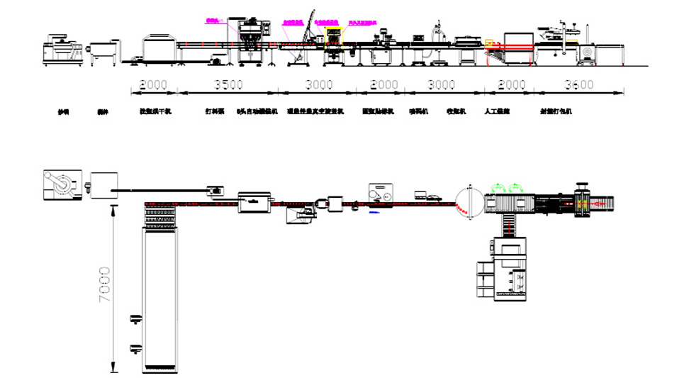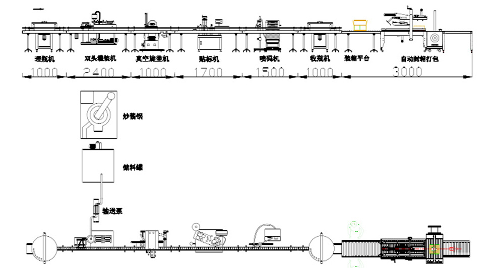 2. 六頭顆粒醬料灌裝生產線設計方案 主要設備:炒鍋 → 攪拌 → 洗瓶烘干機 → 打料泵 → 六頭自動灌裝機 → 理蓋掛蓋真空旋蓋機 → 圓瓶貼標機 → 噴碼機 → 收瓶機 → 人工裝箱 → 封箱打包機